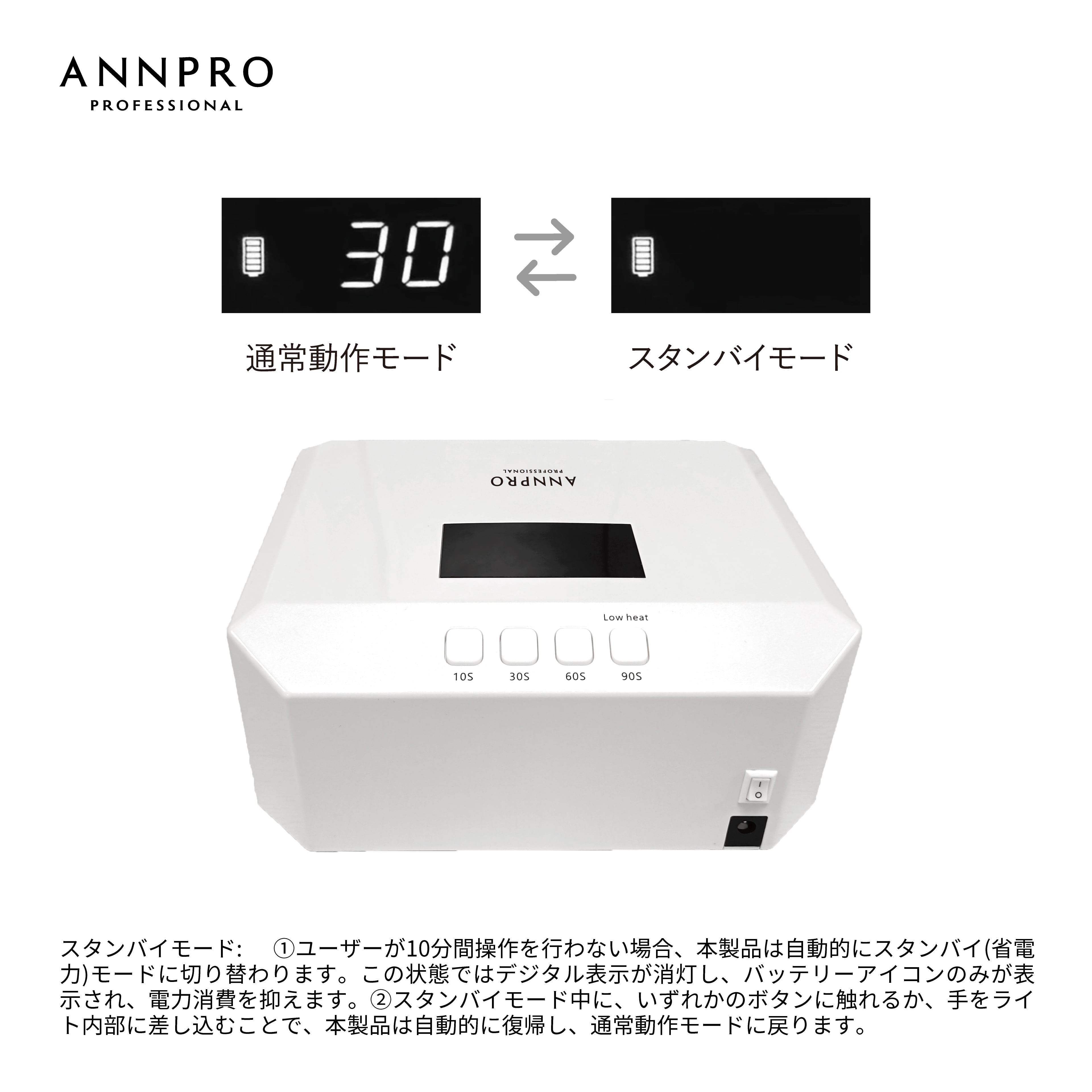 10分間操作がないと自動でスタンバイモードに。電池のムダを抑えて、長く使える設計です。手を入れるだけで、すぐにONに戻ります。