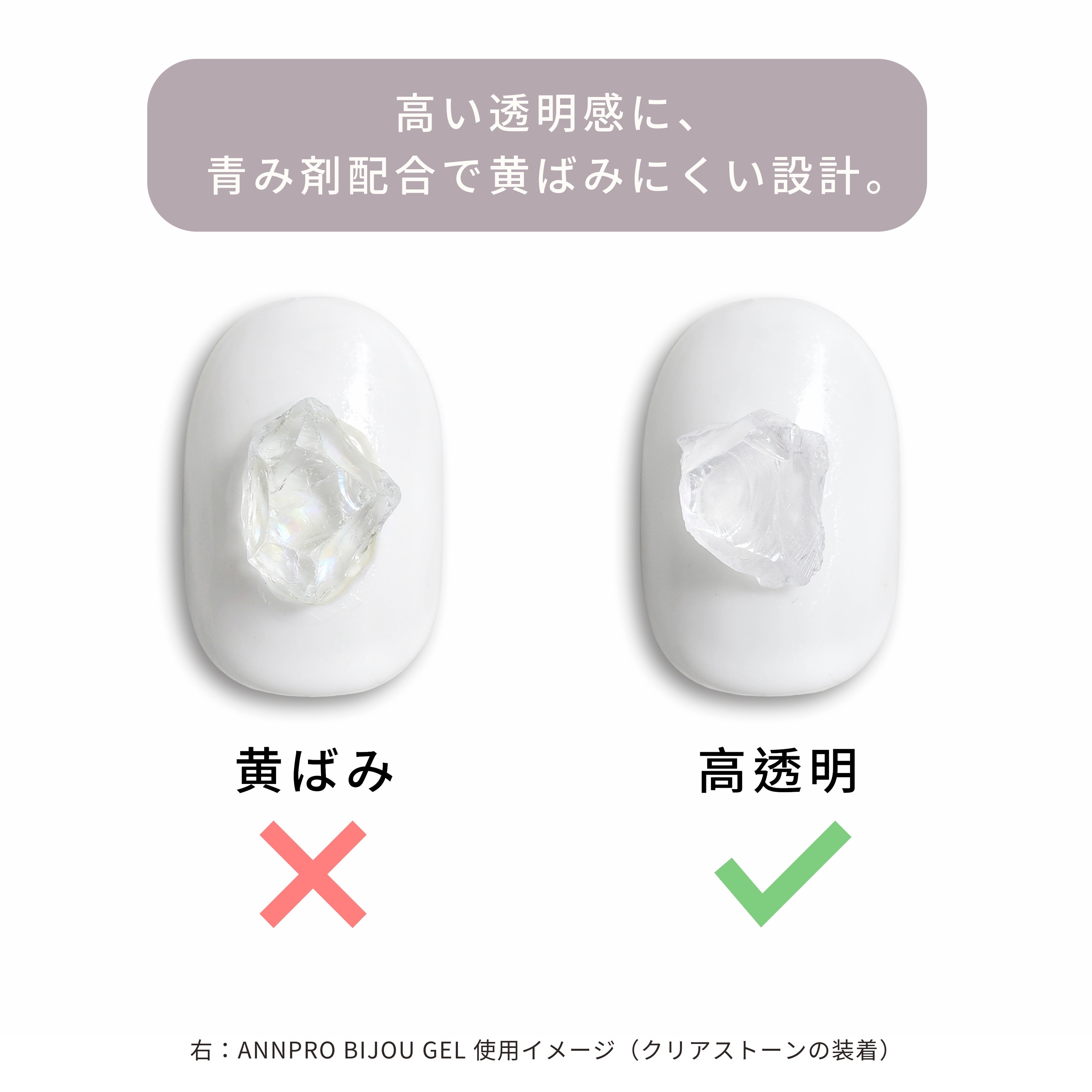 流れにくくピンポイントに置けるため操作性が高く、筆で扱いやすいテクスチャーで細かな作業もスムーズ。透明度が高く、クリアでストーンの輝きを邪魔しない仕上がりです。青みがかったクリアジェルなので、クリア系ストーンも黄ばみにくく、厚みを出しすぎず自然に仕上がります。
