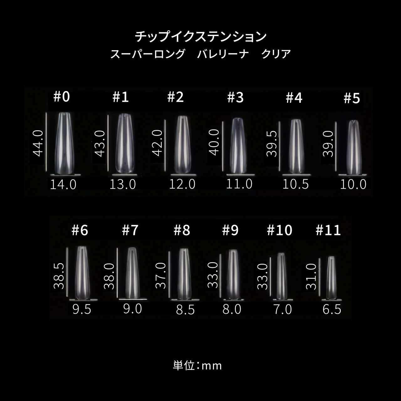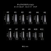 従来のネイルチップよりも長めのスーパーロングサイズ バレリーナ型。付けるだけで綺麗なフォルムになり、簡単にスーパーロングのネイルができるチップです。
